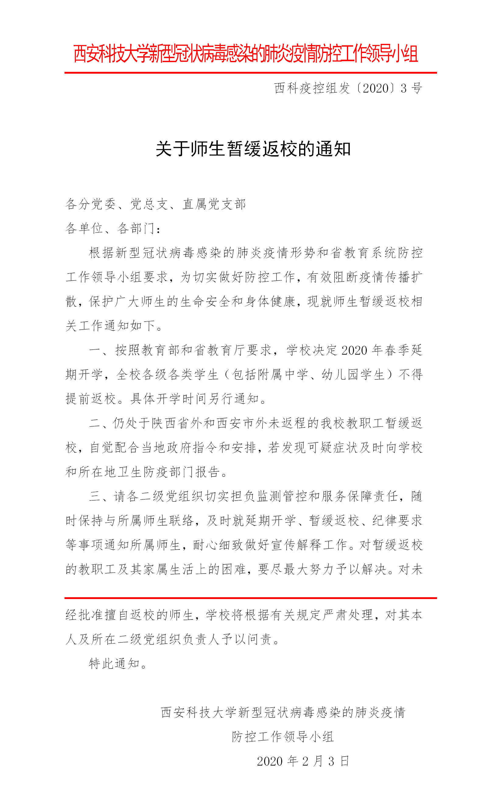 关于师生暂缓返校的通知(3号)