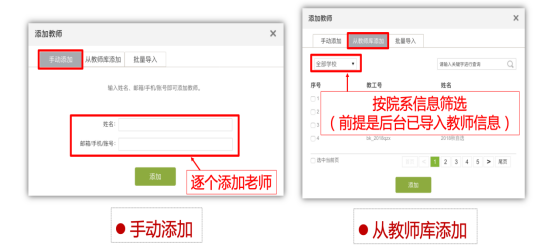 点击添加教师之后,可以通过“手动添加”和“从教师库添加”两种方式来添加。