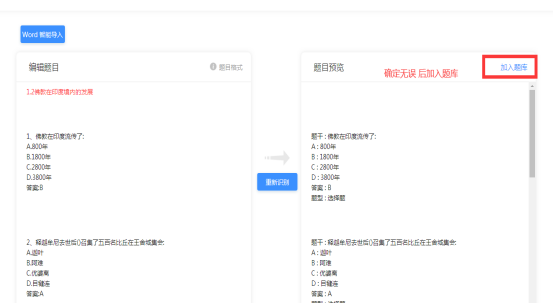 4)重新识别后,在页面右侧“题目预览”区检查题目,确认无误后选择“加入题库”,将试卷题目上传到题库中。