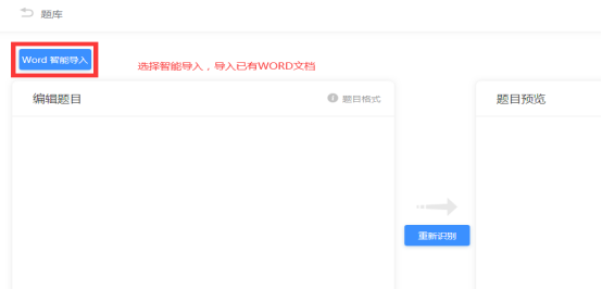 2)在智能导入页面,点击页面“Word智能导入”按钮,选择已经准备好的Word文档上传。