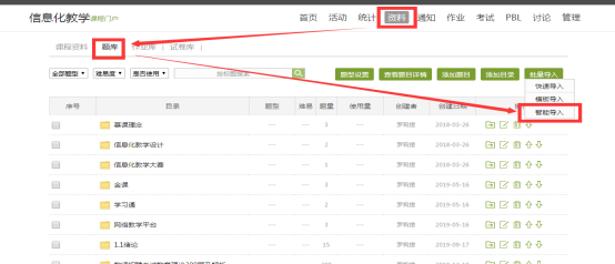 1)访问学校平台,账号密码登录之后,进入课程资料区,选择题库-批量导入-智能导入。