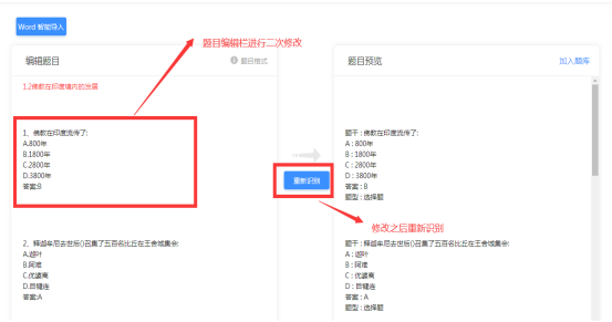 上传成功后,在页面左侧编辑题目的区域可以进行编辑修改,如格式问题、空白行删除等,编辑完成后点击“重新识别”,系统会根据所编辑的内容进行识别调整。